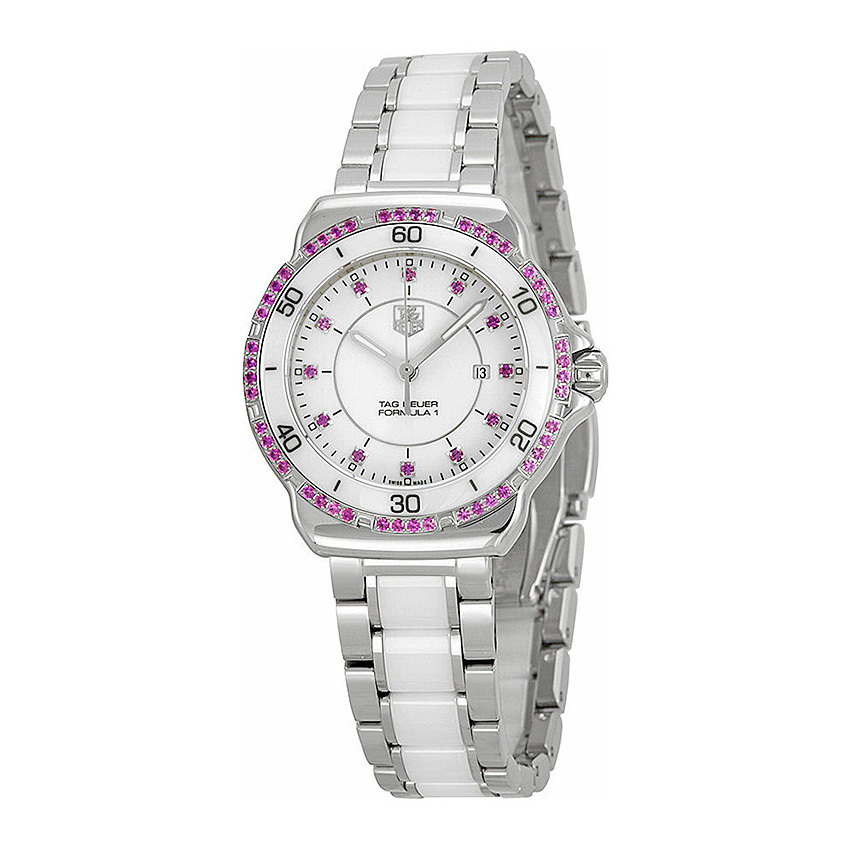 Корпус: Корпус из нержавеющей стали. Полированный неподвижный безель из стали и белой керамики с выгравированной минутной шкалой. Устойчивое к царапинам сапфировое стекло. Белый циферблат. 48 розовых сапфиров на безеле, 12 розовых сапфиров на циферблате. Диаметр 32 мм. Водостойкость 200 м.