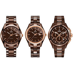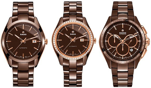 | Коллекция HyperChrome из высокотехнологичной керамики шоколадного цвета (2015) - роскошный шоколадно-коричневый цвет — последний в знаменитой серии оттенков высокотехнологичной керамики Rado: первым три десятилетия назад компания открыла презентабельный черный цвет, за ним последовали безупречный белый, элегантный серый и металлическая плазма. | |