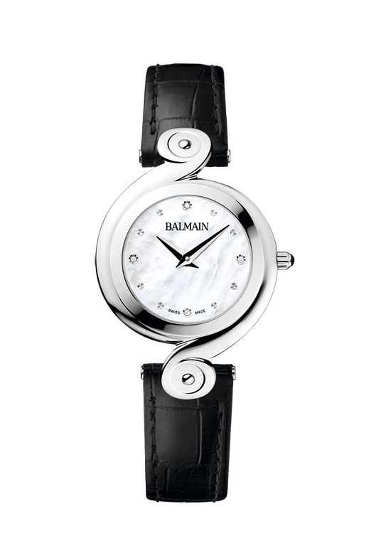 2. Balmain Kerria B4171.32.83 Стальной полированный корпус. Белый перламутровый циферблат с центральными гранёными полированными стальными стрелками часов и минут, с четырьмя бриллиантами в виде условных индексов, с фирменным серебристым узором в форме арабески. Чёрный ремешок из натуральной кожи с полированной стальной застёжкой. |