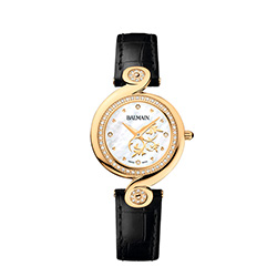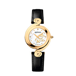 8. Balmain Kerria B4170.32.83 Стальной полированный корпус с жёлто-золотым PVD-покрытием. Белый перламутровый циферблат с центральными гранёными стальными, с жёлтой позолотой, стрелками часов и минут, с четырьмя бриллиантами в виде условных индексов, с фирменным жёлто-золотым узором в форме арабески. Чёрный ремешок из натуральной кожи с застёжкой из стали с жёлтой позолотой. |