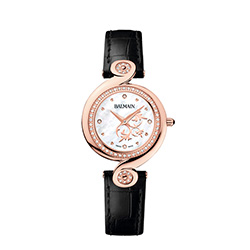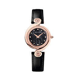 13. Balmain Kerria B4179.32.83 Стальной полированный корпус с розово-золотым PVD-покрытием. Белый перламутровый циферблат с центральными гранёными стальными, с розовой позолотой, стрелками часов и минут, с четырьмя бриллиантами в виде условных индексов, с фирменным розово-золотым узором в форме арабески. Чёрный ремешок из натуральной кожи с застёжкой из стали с розовой позолотой. |