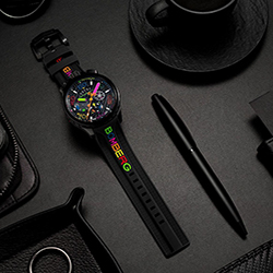 - Ремешок: черный силиконовый с многоцветными буквами BOMBERG