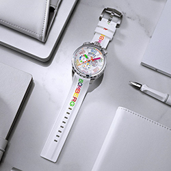 - Ремешок: белый силиконовый с многоцветными буквами BOMBERG
