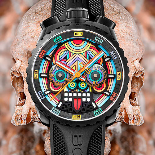 В мексиканской культуре День мертвых (Día de los Muertos) — это праздник, символизирующий не столько смерть, сколько перерождение. Мексиканцы верят, что после физической смерти путь человека продолжается в иной форме, а память о нем живет, пока его вспоминают близкие. День мертвых — это яркий карнавал с символикой черепов, олицетворяющих бесконечность жизни и связи между мирами. Черепа, украшенные узорами и яркими цветами, становятся центральными элементами не только в карнавальных костюмах, но и в коллекциях часов BOMBERG.