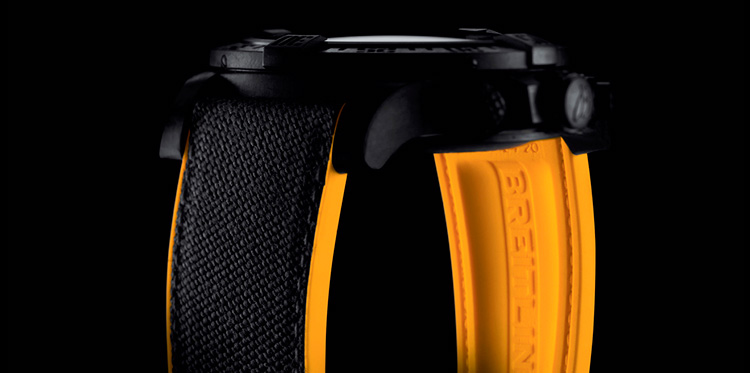 1. Breitling Avenger Hurricane XB1210E4/BE89-257S: матовый чёрный корпус из инновационного полимера «Breitlight®»; чёрный циферблат; ремешок «Diver Pro» из жёлтого каучука и высокопрочного текстиля «Military» цвета антрацит с раскладывающейся застёжкой. | |