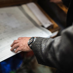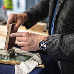 На яркую центральную часовую стрелку оранжевого цвета, а также минутную и центральную секундную стрелки нанесено люминесцентное покрытие по технологии Super-LumiNova®, которое гарантирует удобство считывания времени при любом уровне освещенности. Динамичные красно-оранжевые акценты напоминают опознавательные знаки на фюзеляже самолетов de Havilland Mosquito и подчеркивают уникальный характер модели. Стрелка малого секундного счетчика покрыта черным лаком. На циферблате в положении между «4» и «5» часами находится окошко индикации даты.