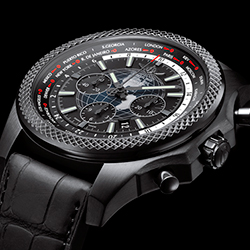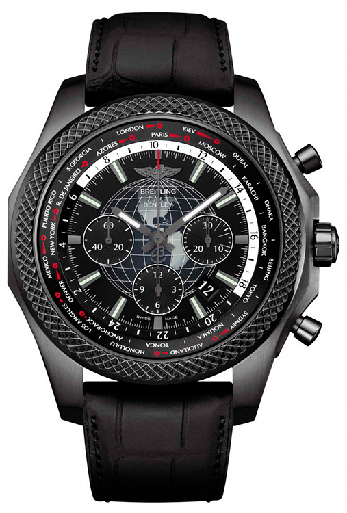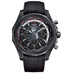 1. Breitling Bentley B05 Unitime Midnight Carbon MB0521V4/BE46/265S/M20DSA.2 Корпус из нержавеющей стали с матовой отделкой и чёрным карбоновым покрытием. Безель чёрного цвета с аутентичной декоративной текстурой. Чёрный (Royal Ebony) циферблат с центральными стрелками, окошком даты, условными индексами и тремя субциферблатами. Чёрный ремешок на каучуковой основе с внешним слоем из матовой крокодиловой кожи. Раскладывающаяся стальная застёжка с чёрным карбоновым покрытием. Ограниченная серия в количестве 500 экземпляров. |