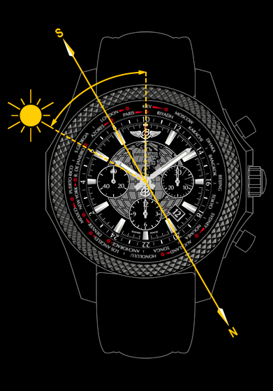Циферблат часов «Breitling Bentley B05 Unitime Midnight Carbon» можно использовать в качестве солнечного компаса для определения сторон горизонта, при этом в регионах, используемых летнее время, необходимо учитывать поправку времени на один час.
