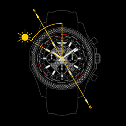 В южном полушарии индекс 12-часовой отметки направляется точно к солнцу. В середине отрезка между местным временем и 12-часовой отметкой на циферблате находится север, юг – в диагонально противоположной стороне циферблата. |
