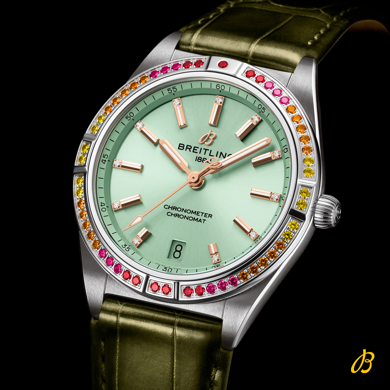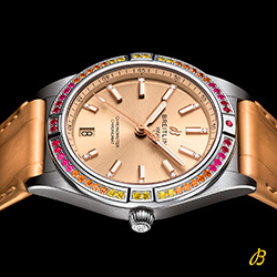 Часы из новой капсульной коллекции Chronomat Automatic 36 South Sea легко узнать по специальным лакированным циферблатам в бежевом, полуночном синем и мятно-зеленом цвете, а также безупречно подобранным ремешкам из кожи аллигатора с раскладными застежками. Особого внимания заслуживают золотые индексы и стрелки, не говоря уже об инкрустированных бриллиантами часовых маркерах и украшенных драгоценными камнями радужных оттенков безелях.