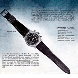 На циферблате самых первых Navitimer, которые были «полностью разработаны в соответствии со спецификациями AOPA», не было ни наименования, ни логотипа компании Breitling. Вместо этого на видном месте – в положении «12 часов» – располагался логотип ассоциации AOPA.