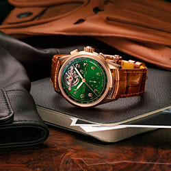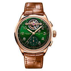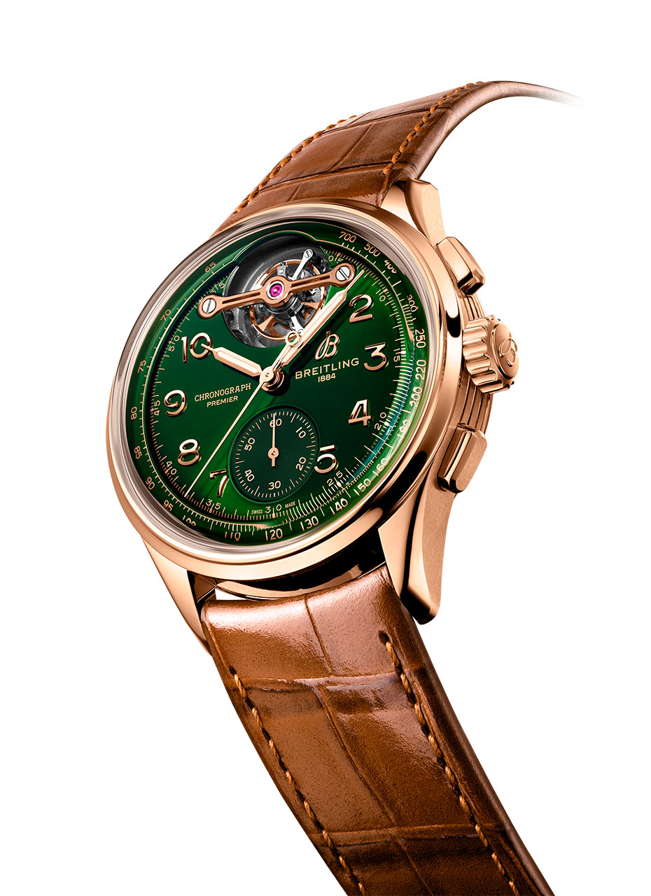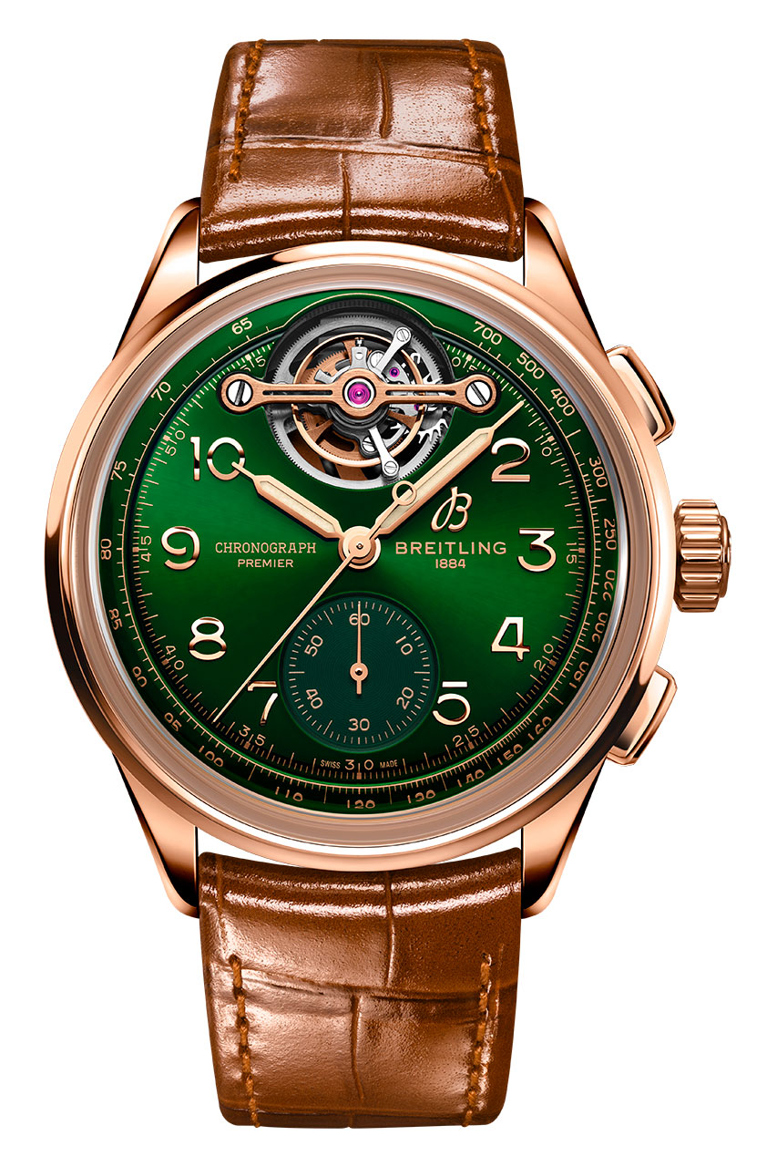 Современная версия Premier, несомненно, достойна репутации своего предшественника. Лимитированная тиражом всего в 25 экземпляров, модель Premier B21 Chronograph Tourbillon 42 Bentley Limited Edition имеет 42-миллиметровый корпус из 18-каратного красного золота, прямоугольные кнопки, золотисто-коричневый ремешок из кожи аллигатора и прозрачную заднюю крышку корпуса из сапфирового стекла. Под ней взору открывается великолепный механизм с ротором из 22-каратного золота. Особого внимания заслуживают специальный калибр хронографа с турбийоном и его корпус, которые можно увидеть за узнаваемым циферблатом зеленого цвета British Racing. С давних пор он ассоциируется с другими моделями, созданными Breitling в сотрудничестве с Bentley.