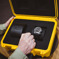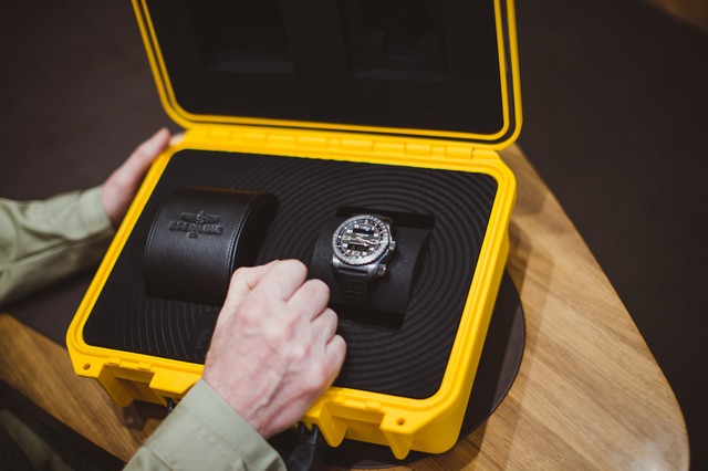 Из всех имеющихся на сегодняшний день моделей часов «Breitling Professional Emergency II» для Фёдора Конюхова была выбрана версия «Night Mission», специально разработанная для подобных рискованных операций. Сложный корпус этой модели часов «Breitling Professional Emergency II», диаметром 51 мм и толщиной (высотой) 21,60 мм, изготовлен из чёрного титана с матовой отделкой. Этот материал обладает такими важными характеристиками, как прочность, лёгкость, гипоалергенность, устойчивость к коррозии и невосприимчивость к электромагнитному воздействию. Поверх корпуса установлен титановый полуматовый вращающийся в двух направлениях рифлёный безель, имеющий шкалу компаса. На боковой стороне корпуса, в направлении «3 часа», установлена крупная рифлёная защищённая заводная головка с интегрированной кнопкой и системой герметичного уплотнения, украшенная логотипом Breitling на торце. На той же боковой стороне и ниже заводной головки расположен активатор антенны радиомаяка. Лицевую сторону корпуса защищает выпуклое сапфировое стекло с двухсторонним антибликовым покрытием. Тыльная сторона корпуса закрыта титановой задней крышкой, укреплённой шестью винтами. Водонепроницаемость конструкции корпуса сохраняется на глубине до 50 м при давлении в 5 атм.