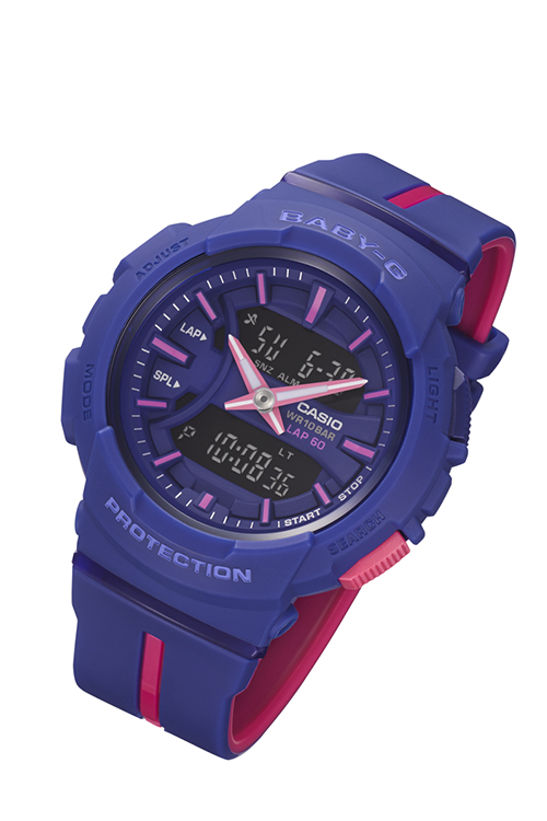 Разработанные специально для бега, японские часы BABY-G от Casio выполнены в спортивном стиле. Их яркая цветовая гамма отлично гармонирует со спортивной одеждой. Часы представлены в четырех цветовых решениях: BGA-240L-7A (белый – лаймово-зеленый), BGA-240L-1A (черный – оранжевый), BGA-240L-2A2 (небесно-голубой – синий), BGA-240L-2A1 (синий – розовый). Новые модели оснащены яркими двухцветными браслетами из полимерного материала. При этом на внешней части есть центральная и боковые вставки второго цвета, который присутствует во внутренней части браслета. Такие декоративные элементы еще больше усиливают спортивный характер моделей, как вокруг циферблата это делает и цветное кольцо.