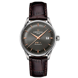 3. Certina DS-1 Powermatic 80 C029.807.16.081.01: корпус из нержавеющей стали, тёмно-серый (антрацитовый) циферблат, стрелки и условные индексы с PVD-покрытием из розового золота, прозрачная задняя крышка, тёмно-коричневый кожаный ремешок. | |