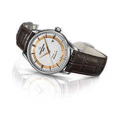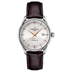 5. Certina DS-1 Powermatic 80 C029.807.16.031.01: корпус из нержавеющей стали, серебристый циферблат, стрелки и условные индексы с PVD-покрытием из розового золота, прозрачная задняя крышка, тёмно-коричневый кожаный ремешок. | |