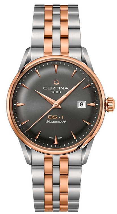 9. Certina DS-1 Powermatic 80 C029.807.22.081.00: корпус из нержавеющей стали, безель и заводная головка с PVD-покрытием из розового золота; тёмно-серый (антрацитовый) циферблат, стрелки и условные индексы с PVD-покрытием из розового золота, прозрачная задняя крышка, 5-рядный браслет из нержавеющей стали с чётными рядами, имеющими отделку PVD-покрытием из розового золота. |