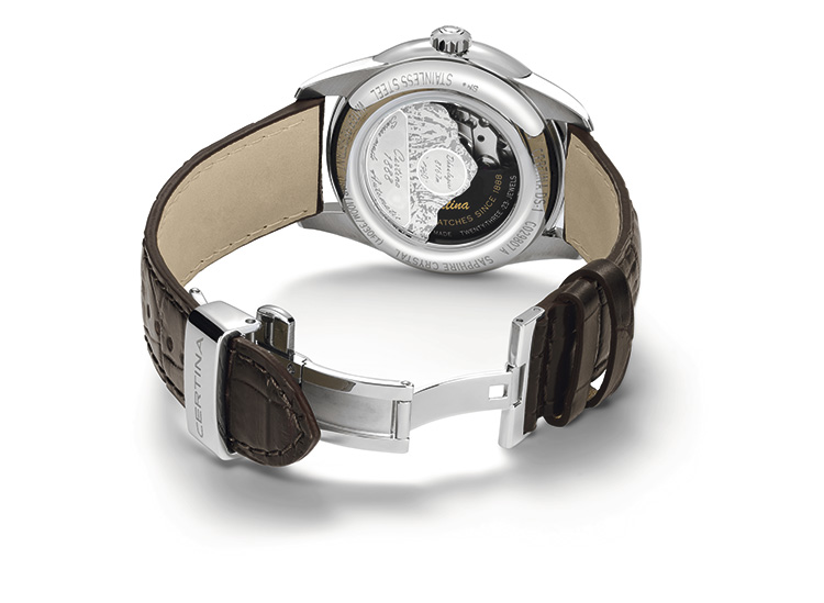 Часы «Certina DS-1 Powermatic 80» оснащены тёмно-коричневым ремешком из натуральной кожи с боковой прострочкой или 5-рядным браслетом из нержавеющей стали, который у двух моделей декорирован чётными рядами с PVD-покрытием из розового золота. Ремешок и браслет комплектуются раскладывающейся застёжкой-бабочкой с двумя кнопками, которая гарантирует удобное и безопасное ношение часов на запястье.