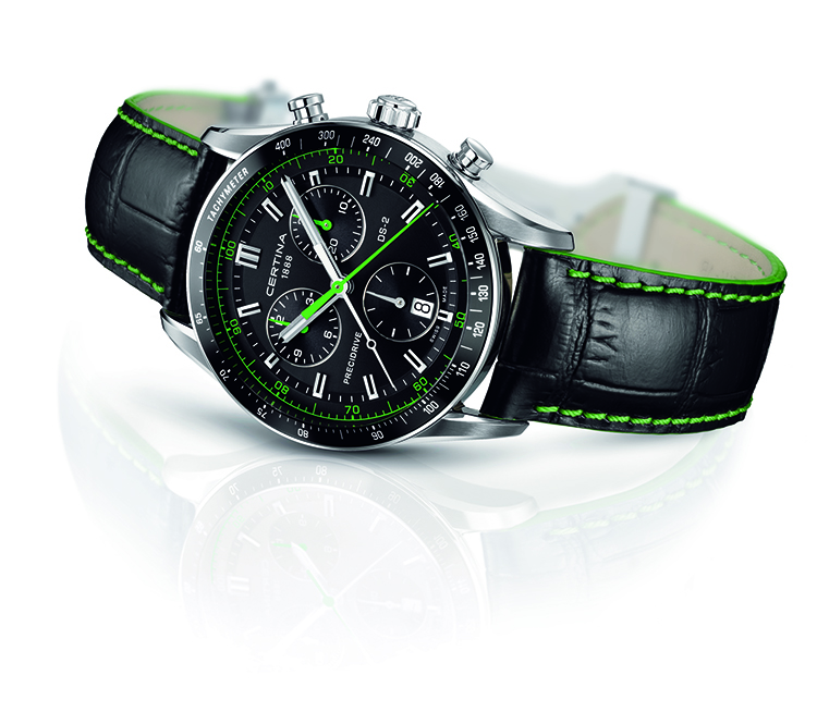 - Модель «Certina DS-2 Chronograph» C024.447.16.051.02 с чёрным циферблатом, зелеными стрелками 1/100-секундного, 30-минутного и 12-часового счётчиков, белой стрелкой 60-секундного счётчика и зелёной 1/100 секундной шкалой.