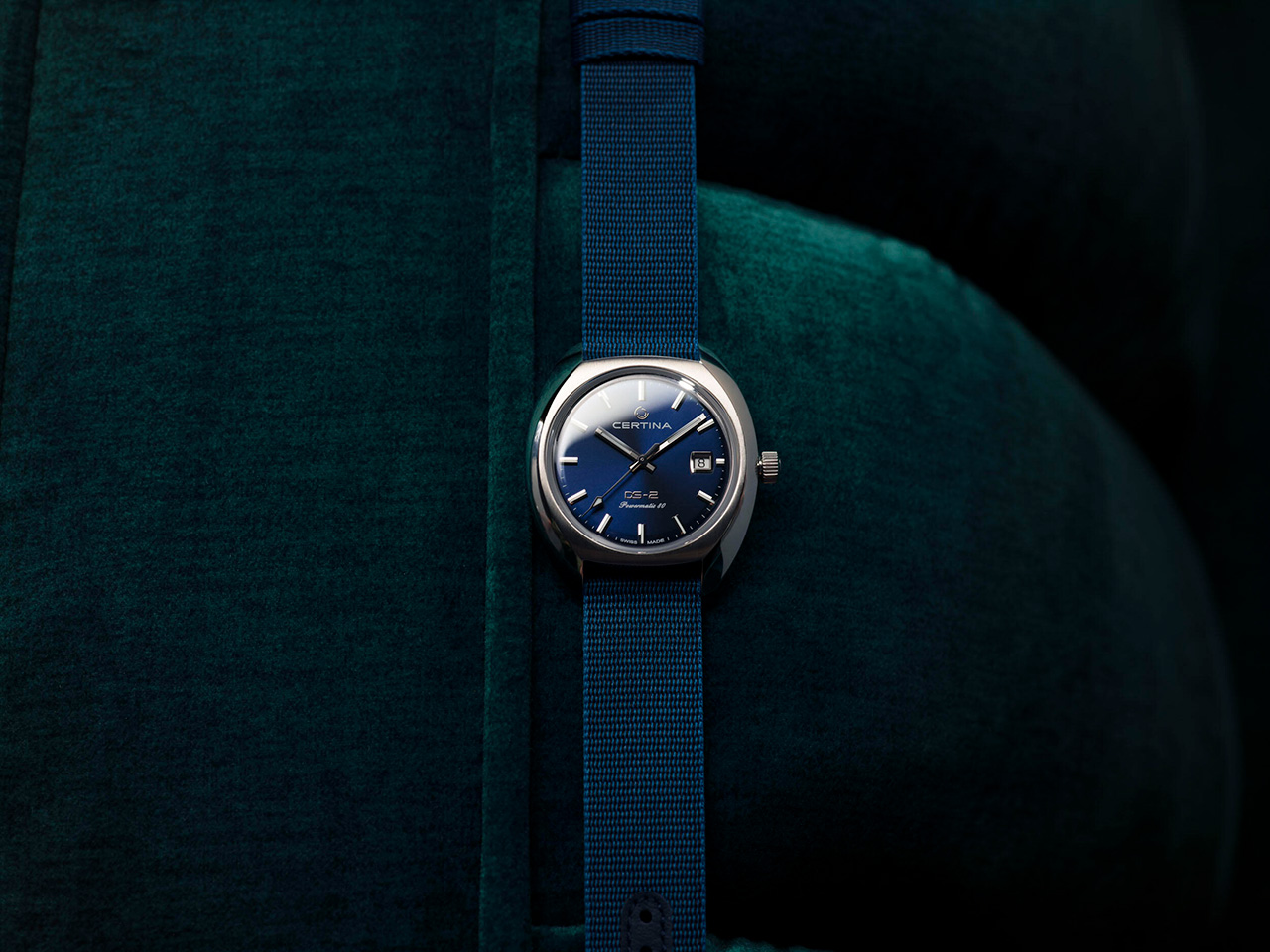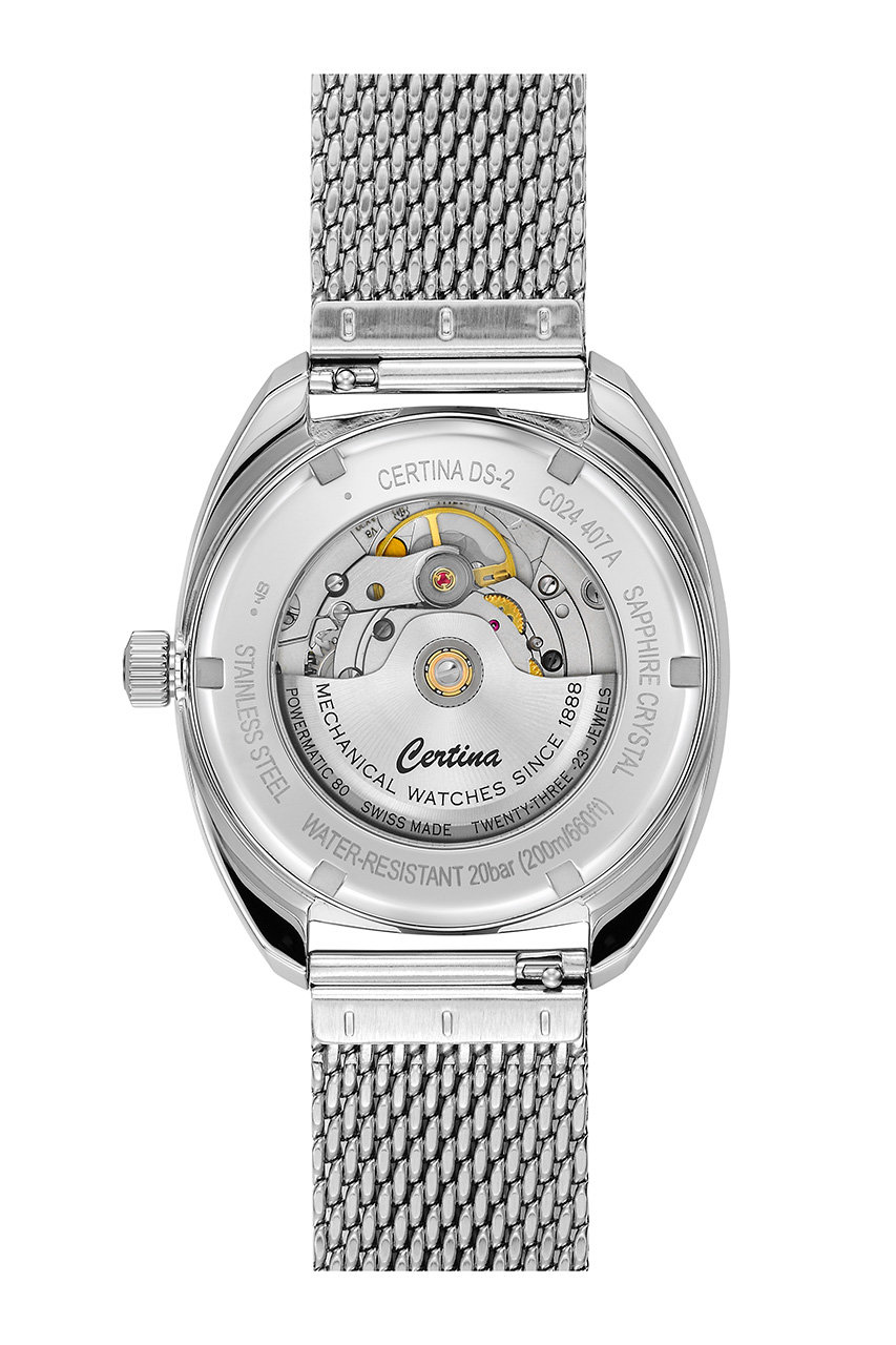 Первая модель DS-2 1968 года выпуска знаменовала новый этап для марки Certina с точки зрения создания прочных часовых механизмов. Она стала естественным и стильным продолжением истории успеха, начавшейся за девять лет до этого с выпуска модели DS-1. Как историческая модель DS-2, так и ее современное исполнение отличаются бочкообразной формой корпуса, формой «обрезанного с двух сторон эллипса», как гласила реклама 1968-го года. Сглаженные углы и грани сочетаются с круглым циферблатом, защищенным сапфировым стеклом. Новые часы DS-2 доступны в четырех вариантах исполнения – в матовом черном или серебристом оттенках, с синим или черным сатинированным циферблатом. Прямоугольные стрелки и индексы с покрытием Super-LumiNova® подчеркивают винтажный характер модели. Стальной корпус шириной 40 мм и длиной 38 мм дополнен браслетом с миланским плетением или ремешком NATO из материала #tide ocean material®, в основе которого – океанический пластик.