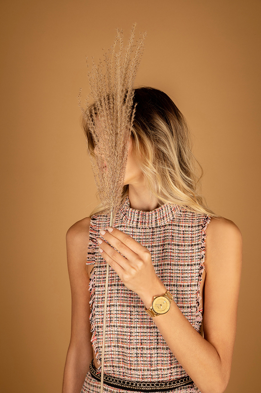 - Циферблат цвета желтого золота с безелем цвета желтого золота.