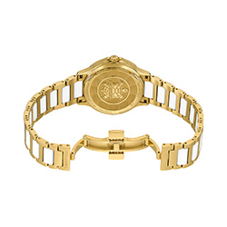 - Браслет из нержавеющей стали с PVD-покрытием цвета желтого золота и белыми керамическими звеньями.