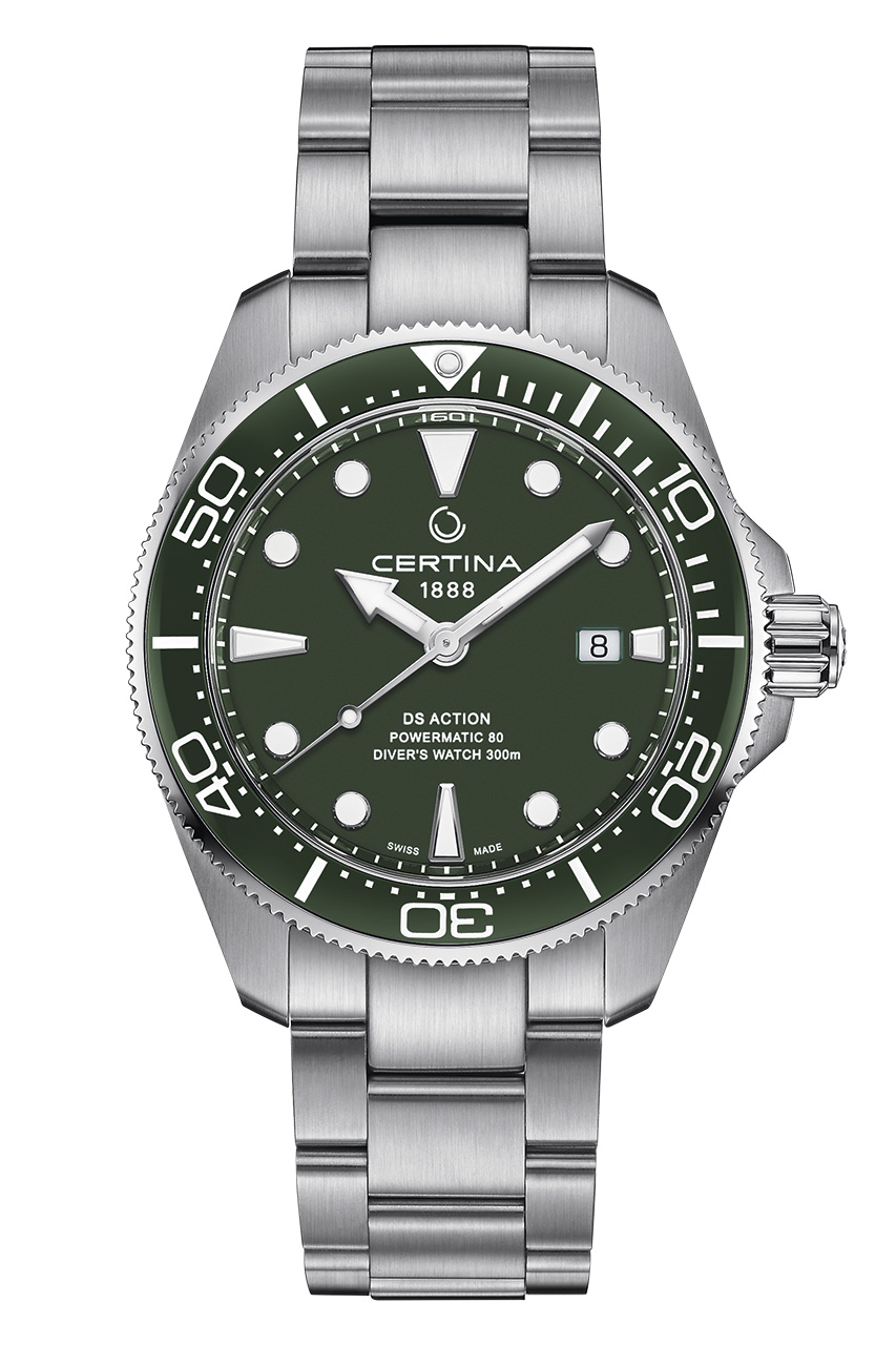 Модель DS Action Diver в стальном корпусе диаметром 43 мм – одна из самых популярных в коллекции Certina. Теперь марка выпускает обновленную версию, верную характеру оригинала, но с усовершенствованными элементами. Так, часы имеют однонаправленно вращающийся безель из полированной черной керамики, известной своей устойчивостью к царапинам. Цветной циферблат украшают выразительные стрелки и индексы с покрытием Super-LumiNova®, обеспечивающие улучшенную считываемость показаний в условиях пониженной освещенности. Часы дополнены браслетом из стали со встроенным удлинением для дайвинга. Модель представлена в синем и зеленом цветах, в исполнении из титана или в двухцветном исполнении.