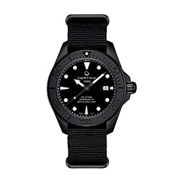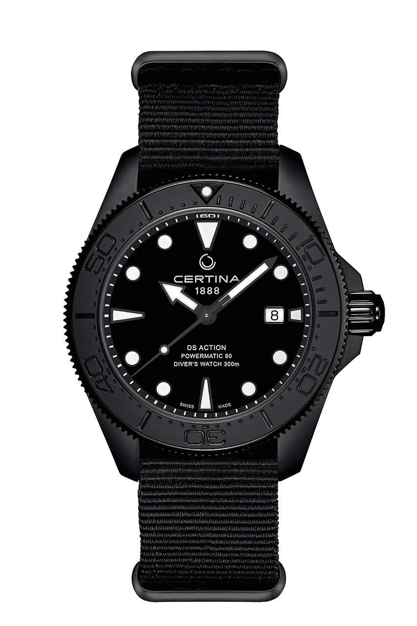 Поднимаясь на поверхность из темных океанских глубин… Новые часы DS Action Diver 43 мм от Certina полностью выполнены в черном цвете. Как истинные дайверские часы они не боятся никаких глубин благодаря водонепроницаемости до 300 метров и идеально подходят для любых приключений – на суше и под водой. Кроме того, черный корпус из нержавеющей стали, вращающийся безель с матовой черной керамической вставкой и ремешок NATO темного цвета превращают эти элегантные часы в настоящий образец стиля.