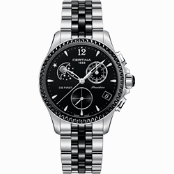 1. Certina DS First Lady Chronograph Moon Phase C030.250.11.056.00 Корпус из нержавеющей стали с матовой отделкой, чёрный керамический безель. Чёрный глянцевый циферблат с бриллиантом Top Wessselton VS-SI 0,0038 карата; центральные стрелки, условные часовые индексы, цифра «12», секундный субциферблат, 30-минутный счётчик хронографа, рамка окошка даты и оправа бриллианта – с серебристым PVD-покрытием. 5-рядный браслет из нержавеющей стали с центральными рядами звеньев из чёрной керамики и застёжкой-бабочкой с двумя кнопками. |