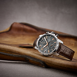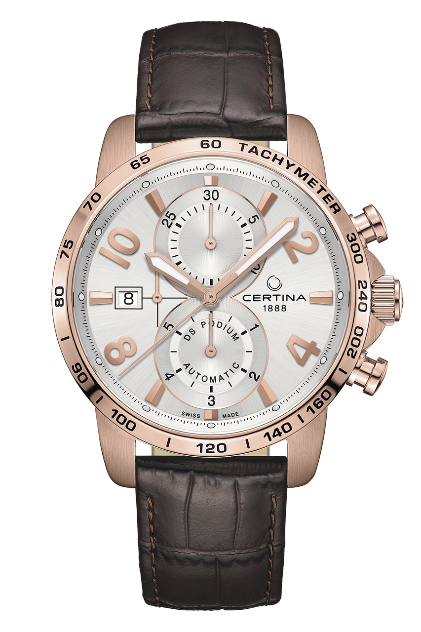 Часы DS Podium – это классическая спортивная модель Certina. Ее новейшее воплощение привносит в коллекцию современные нотки: корпус из нержавеющей стали диаметром 44 мм обрамляет серый циферблат с гильоше «Солнечные лучи». Стильный акцент задают элементы с напылением из красного золота – крупные цифры и часовые отметки, стрелки и элегантная отделка счетчиков хронографа. Эффектные кнопки расположены сбоку от завинчивающейся заводной головки с системой защиты. Темно-коричневый ремешок из телячьей кожи с тиснением под крокодила и застежка-бабочка обеспечивают надежную и комфортную посадку на запястье.