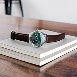 - C038.407.16.097.00 Зеленый циферблат, корпус из нержавеющей стали, темно-коричневый кожаный ремешок.