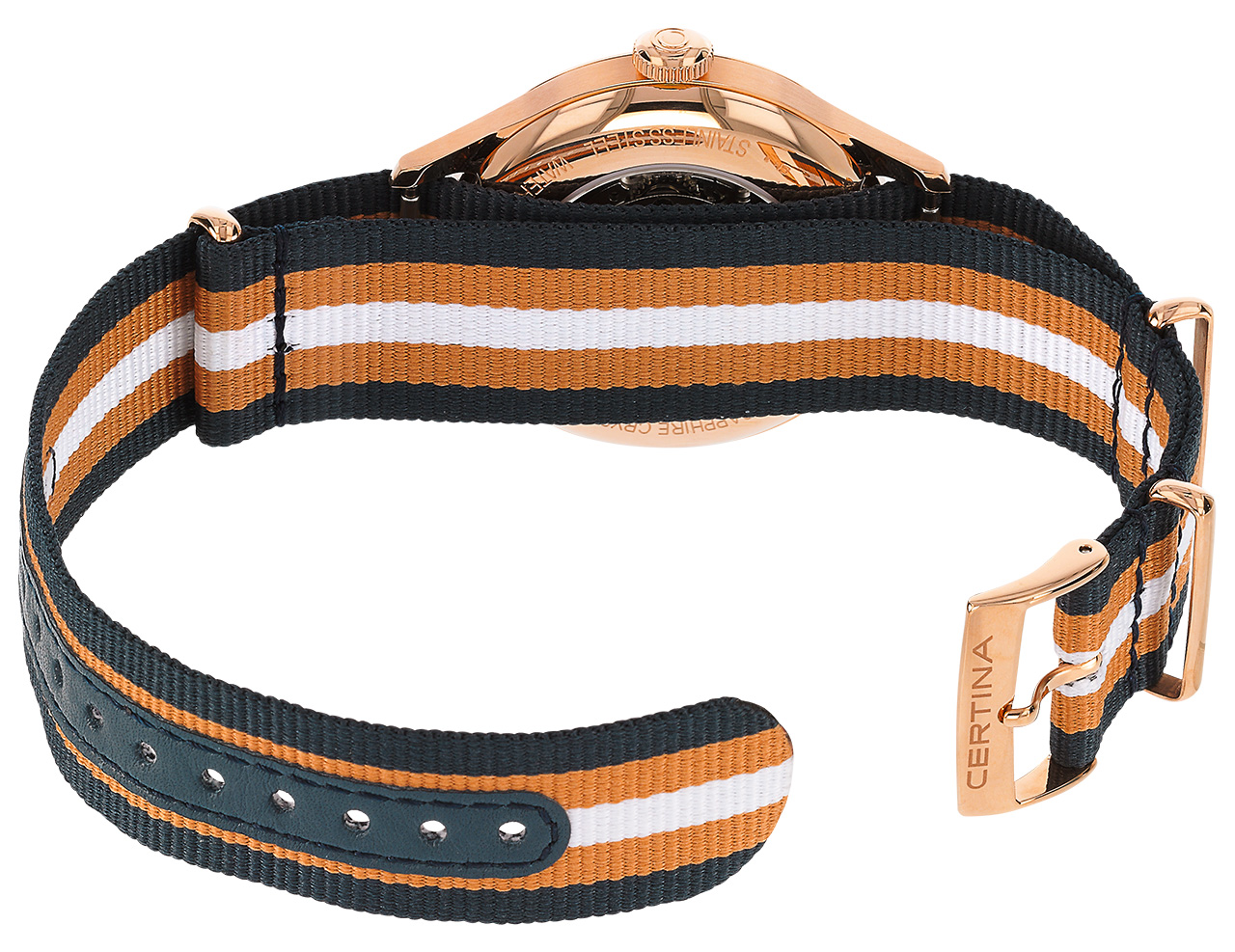 - C038.407.18.047.00 Синий циферблат, корпус из нержавеющей стали, полосатый ремешок NATO.