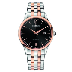 6. Classic R Automatic B.3988.33.64: стальной корпус с PVD-покрытием розовым золотом, стальной браслет с PVD-покрытием розовым золотом чётных звеньев; чёрный циферблат, украшенный гильоше в стиле «солнечные лучи» (Rayonne) с арабскими цифрами 6, 12 и десятью условными индексами с PVD-покрытием розовым золотом. |