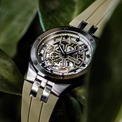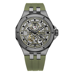 Часы Delfin Mecano от Edox стали настоящим хитом среди любителей часов по всему миру. Теперь бутик швейцарского часового производителя расширяет семейство Delfin Mecano новой моделью, выполненной в изысканной прохладной цветовой гамме. Сочетание грифельно-серого безеля и выступов в сочетании с ремешком цвета мха и скелетонизированными вставками на циферблате создает на запястье смелый, но утонченный вид часов.
