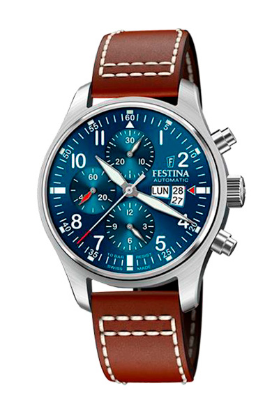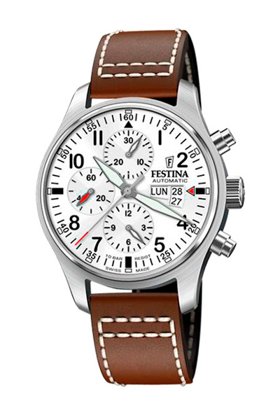 Линейка Swiss Made бренда Festina пополнилась механическими часами с автоподзаводом – хронографом F20150. Эти часы выполнены в традиционном дизайне пилотских часов с красной стрелкой.