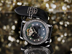 Новые часы "Black Beauty" с насыщенно чёрным, перламутровым циферблатом и россыпью бриллиантов способны сфокусировать на себе внимание даже самых пристрастных ценителей часового искусства, поскольку внешний вид Black Beauty достаточно оригинален. Его квинтэссенцией является запатентованный дизайн циферблата, на котором находится отверстие, по форме похожее на два слившихся сердца, демонстрирующих пульсацию механизма часов. Эта дизайнерская находка превращает часы "Black Beauty" в некий сплав чувственности и романтизма, который выводит их за пределы обычного представления о часах.