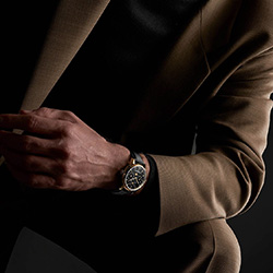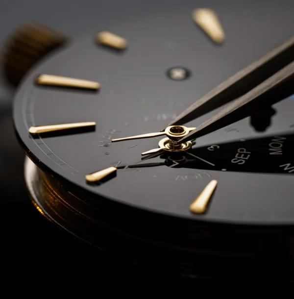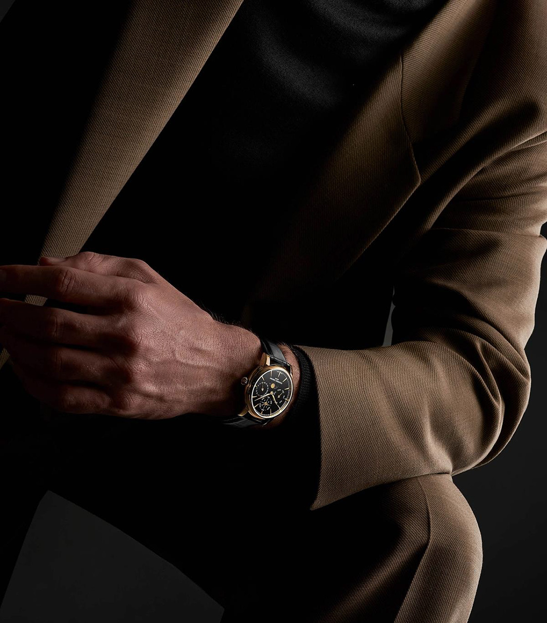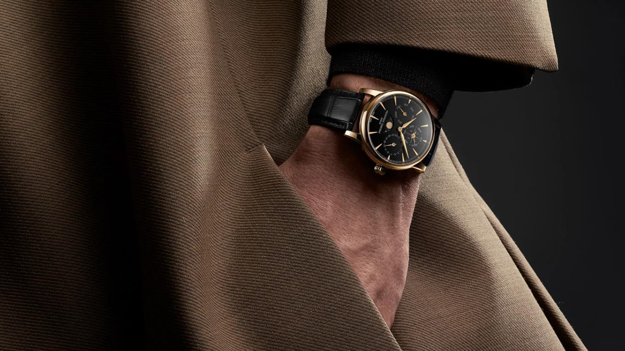 Глубокий чёрный циферблат из оникса создаёт выразительный контраст с золотыми стрелками и корпусом. Индикация дня, даты, месяца, високосного года и фаз Луны выстроена симметрично и легко читается. Модель выпущена ограниченной серией и предназначена для коллекционеров и ценителей сложной классической механики.