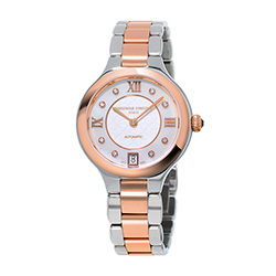 2. Frederique Constant Classics Delight Automatic FC-306WHD3ER2B Корпус из полированной нержавеющей стали с розово-золотым гальваническим покрытием безеля. Циферблат с отделкой серебристым перламутром по цифровому полю и белым узором гильоше по центру. Центральные стрелки и римские цифры с розово-золотым гальваническим покрытием, восемь бриллиантов в виде условных индексов, прямоугольное окошко даты. 3-рядный браслет из нержавеющей стали с розово-золотым гальваническим покрытием центральных звеньев. Раскладывающаяся стальная застёжка с розово-золотым гальваническим напылением. |