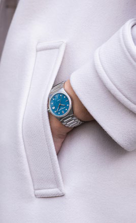 В любое время дня и ночи часы будут сиять. Безель элегантно украшают 60 бриллиантов (0,50 карата), сверкающих в ритме посеребренных и отполированных вручную стрелок, покрытых светонакопителем. Не отстают и часовые метки: попарно расположенные восемь бриллиантов, распределенные по четырем четвертям циферблата, заставляют их сиять, словно звезды. Несколько накладных люминесцентных индексов напоминают последние лучи солнца на закате. И прежде, чем Земля завершит свое вращение, незаметное окошко даты в положении «3 часа» объявит о наступлении следующего дня...