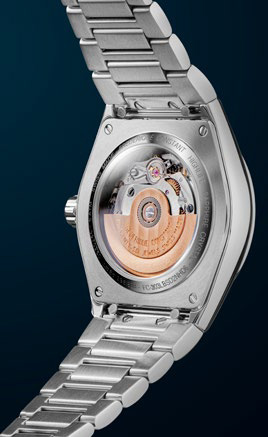 Наконец, сквозь заднюю крышку часов можно увидеть автоматический механизм, приводящий их в движение. Это калибр FC-303, украшенный спиральным узором и гарантирующий 38-часовой запас хода.