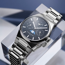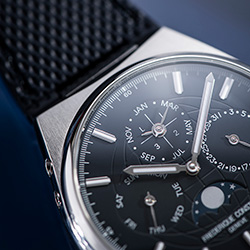 Этот новый циферблат, объединивший оттенки синего, серого и черного цветов, олицетворяет неуловимый сумеречный миг, когда ускользающий дневной свет уступает место звездному небосводу. Вечный календарь позволяет определять не только дни недели, но и фазы Луны. Он дополнен индикаторами даты, месяца и високосных лет, которые умещаются на одном циферблате и обеспечивают простое и интуитивно понятное считывание показаний.