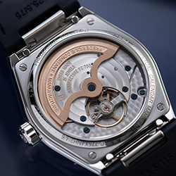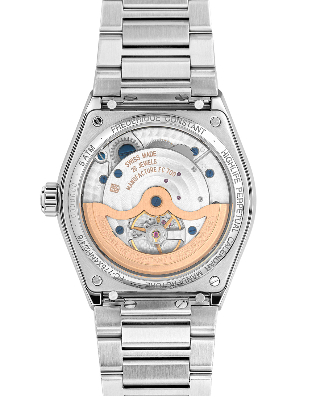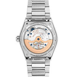 К удовольствию любителей часов, данная модель позволяет любоваться механизмом с автоподзаводом Manufacture FC-775, украшенным изысканным жемчужным зернением Perlage и декором Côtes de Genève, благодаря особой конструкции задней стенки.