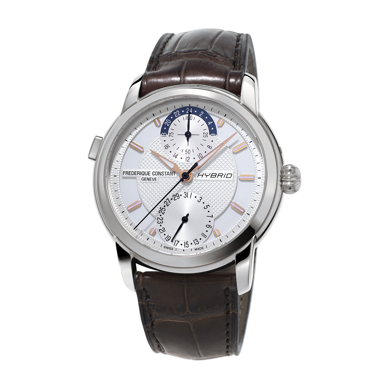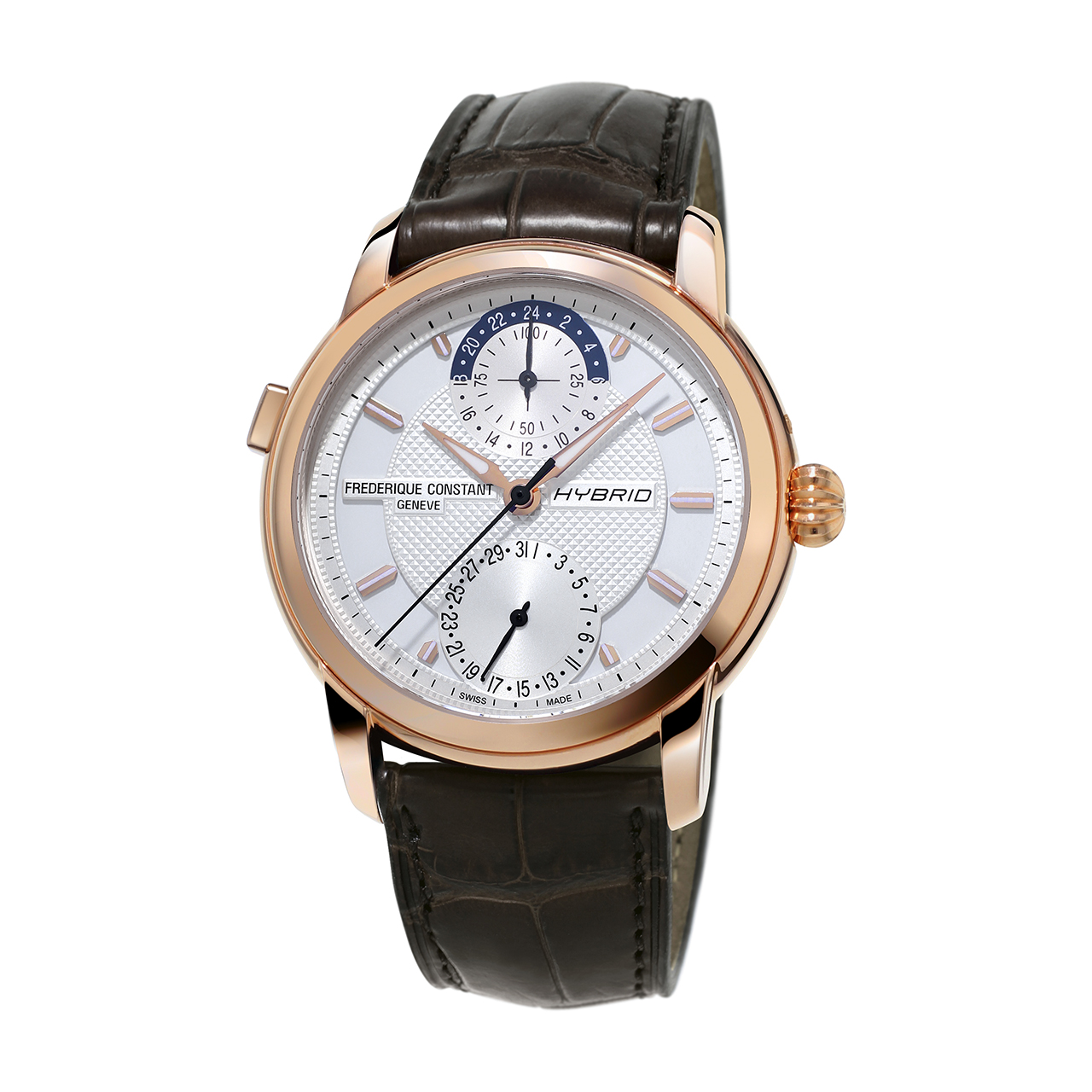 Может показаться, что Hybrid Manufacture – просто очередные швейцарские часы. Совсем наоборот! Благодаря изящному корпусу и циферблату в классическом стиле часы Frederique Constant Hybrid Manufacture носятся легко, добавляя элегантность любому запястью. За этим неподвластным времени дизайном скрыт механизм с потрясающими функциональными возможностями.