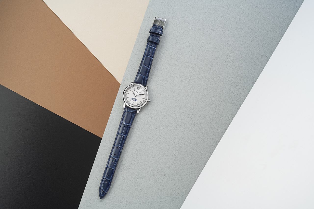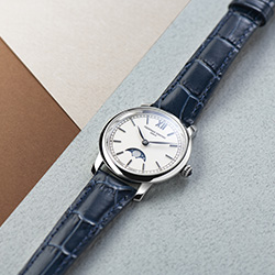 В то же время две новые модели Slimline Ladies Moonphase вобрали в себя и достижения технического прогресса в часовой индустрии: в их сердце бьется кварцевый механизм FC-206 с элементом питания, рассчитанным на пять лет работы. Калибр приводит в движение две центральные (часовую и минутную) стрелки в виде листьев с плавным изгибом в центре, которые также выдержаны в перламутрово-черном оттенке. В нижней части циферблата, в положении «6 часов», находится указатель фаз Луны в форме полумесяца, на котором естественный спутник Земли предстает во всем своем великолепии в окружении звезд на темно-синем фоне, напоминающем ночное небо.