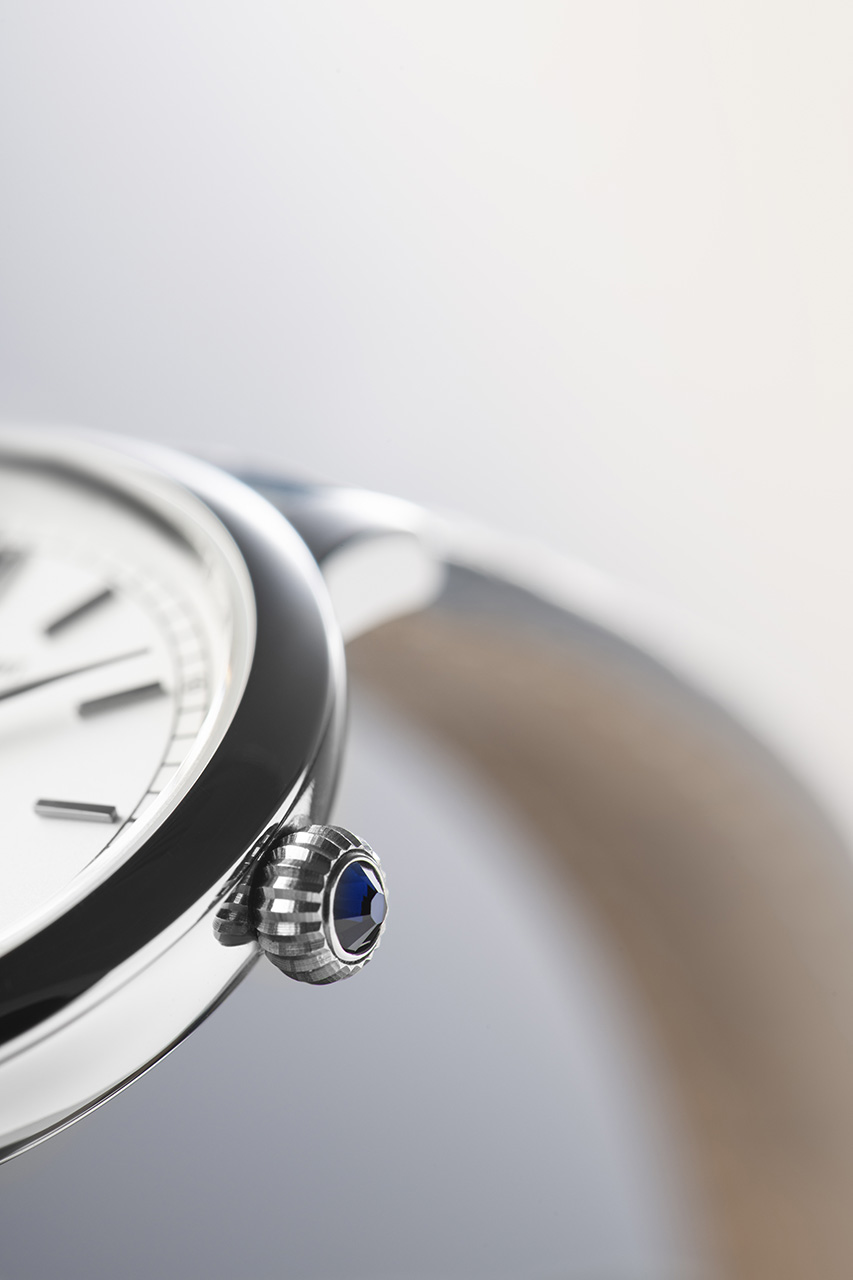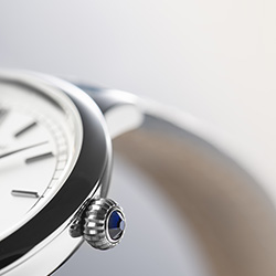 В отличие от предшественниц в новых моделях лишь метка в положении «12 часов» выполнена в виде римской цифры XII. По обе стороны от нее, на обновленной минутной шкале по периметру циферблата расположены по пять арабских цифр. Мерный бег разметки деликатно прерывает надпись Swiss Made в положении «6 часов», которая служит подлинным свидетельством высокого качества изделия. Эта изящная интерпретация минутной шкалы, известная под названием «железная дорога», напоминает дизайн «секторных циферблатов», которыми оснащались культовые модели 1920–1940-х годов. Стремление к большей эстетической привлекательности нашло воплощение в заводной головке в форме луковицы, увенчанной элегантным синим камнем огранки кабошон.