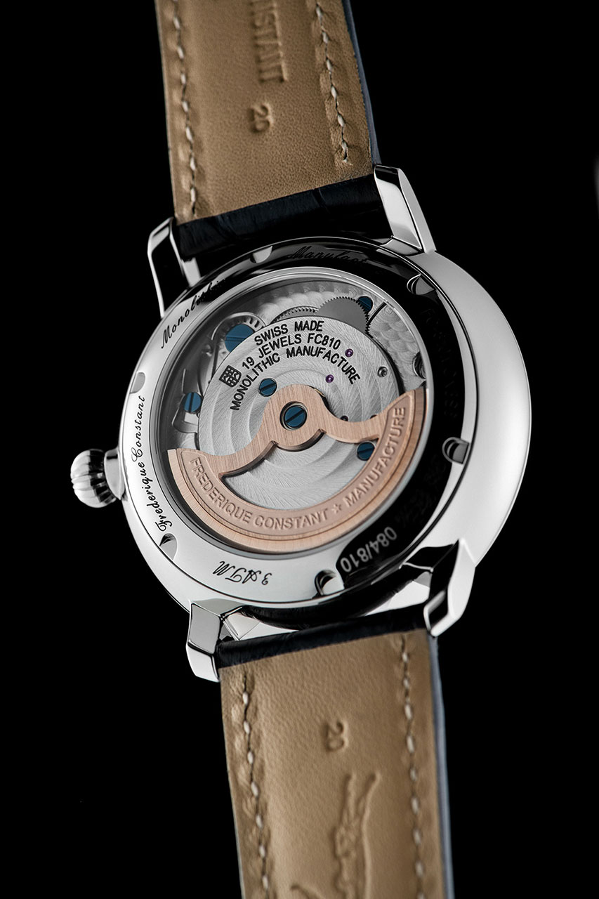 На оборотной стороне прозрачная задняя крышка обеспечивает полный обзор автоматического калибра FC-810. В традиционном декоре женевские полосы сочетаются с жемчужным зернением, а колеблющийся груз имеет ажурную структуру.