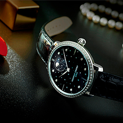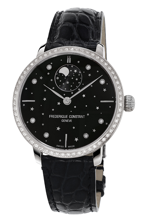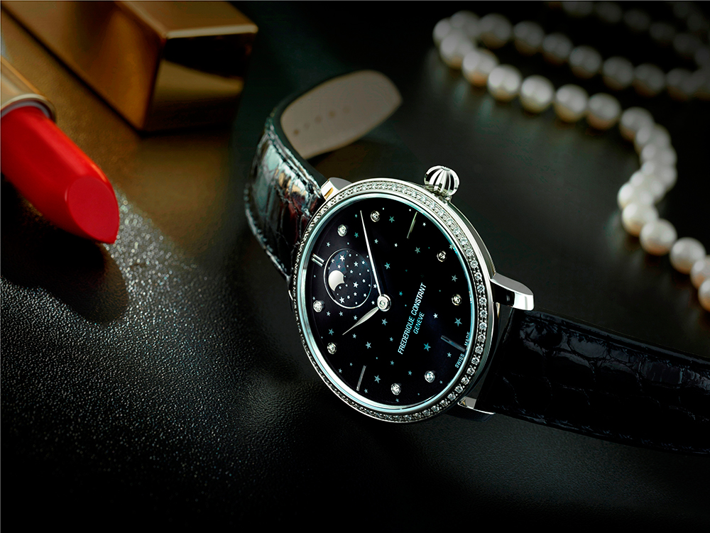 Slimline Moonphase Stars Manufacture от Frederique Constant: россыпь звезд и бриллиантов на запястье женщины