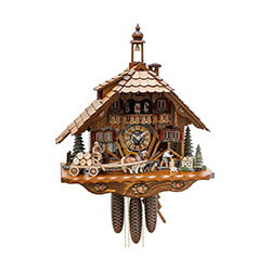 - На переднем плане — миниатюрная сцена из сельской жизни: запряжённая лошадь везёт телегу с бочками, а рядом располагается дровосек, который начинает рубить дрова всякий раз, когда кукушка выходит из своего домика.