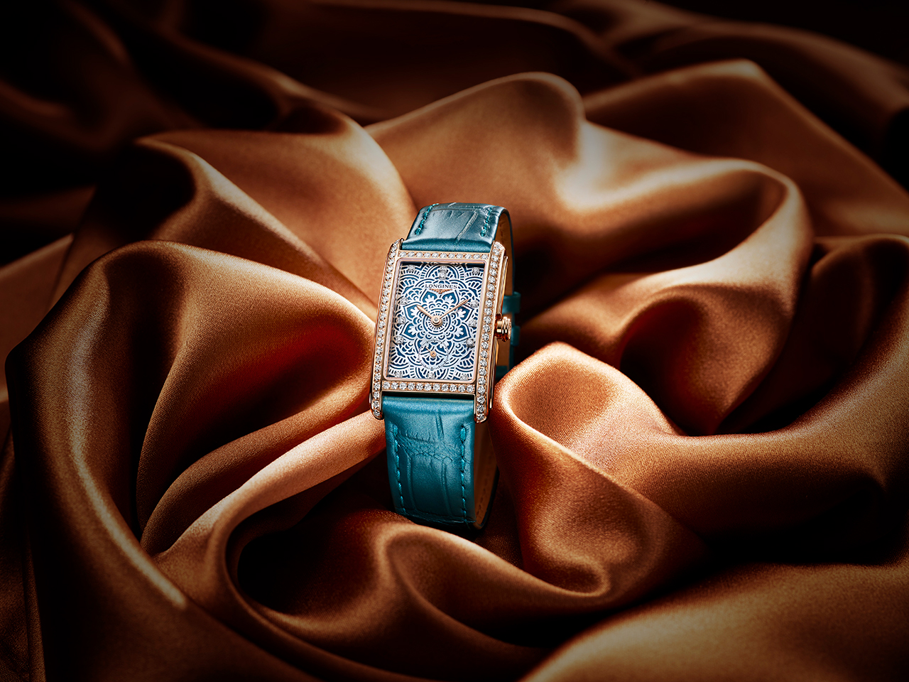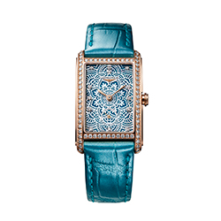 Эти часы отличаются прямоугольной формой и вдохновлены моделями 1920-х годов. Новая коллекция воспевает итальянскую «сладкую жизнь» с ее непринужденной изысканностью. Часы The Longines DolceVita Elegance Celebration – Limited Edition украшены бирюзовым циферблатом с перламутровым узором-мандалой и бриллиантовыми индексами. Корпус из розового золота, окаймленный 68 бриллиантами, дополнен бирюзовым кожаным ремешком.