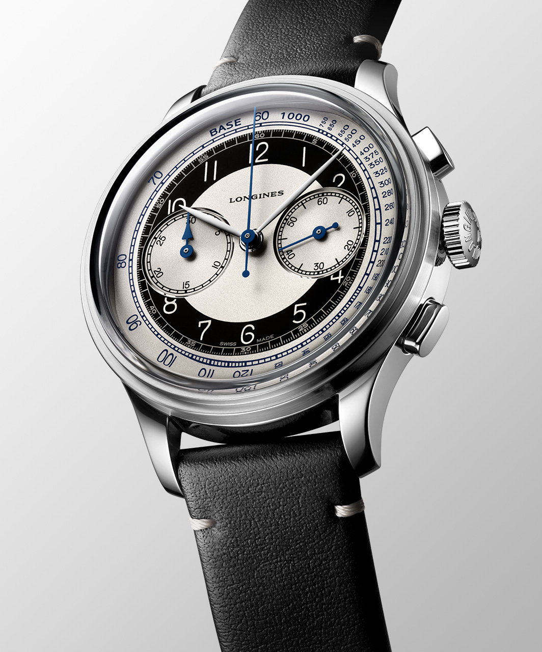 Версия с хронографом оснащена циферблатом, который сочетает в себе матовый черный, опаловый и темно-синий цвета, придающие модели особую элегантность. Часы отличаются изысканным циферблатом, разделенным на несколько зон. Тахиметрическая шкала, довольно редко встречающаяся в часах Longines, но при этом присутствовавшая на оригинальной модели, подчеркивает округлую форму циферблата. Хронограф The Longines Heritage Classic — Tuxedo c корпусом диаметром 40 мм оснащен механизмом L895.5, эксклюзивно разработанным для коллекции The Longines Heritage. Данный механизм также оснащен кремниевой пружиной баланса